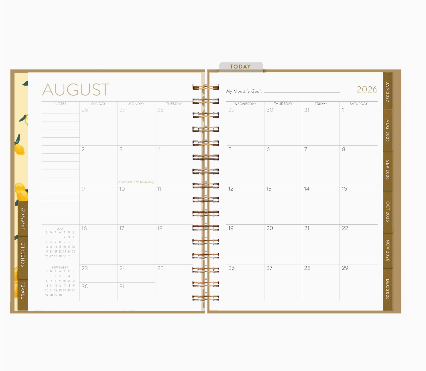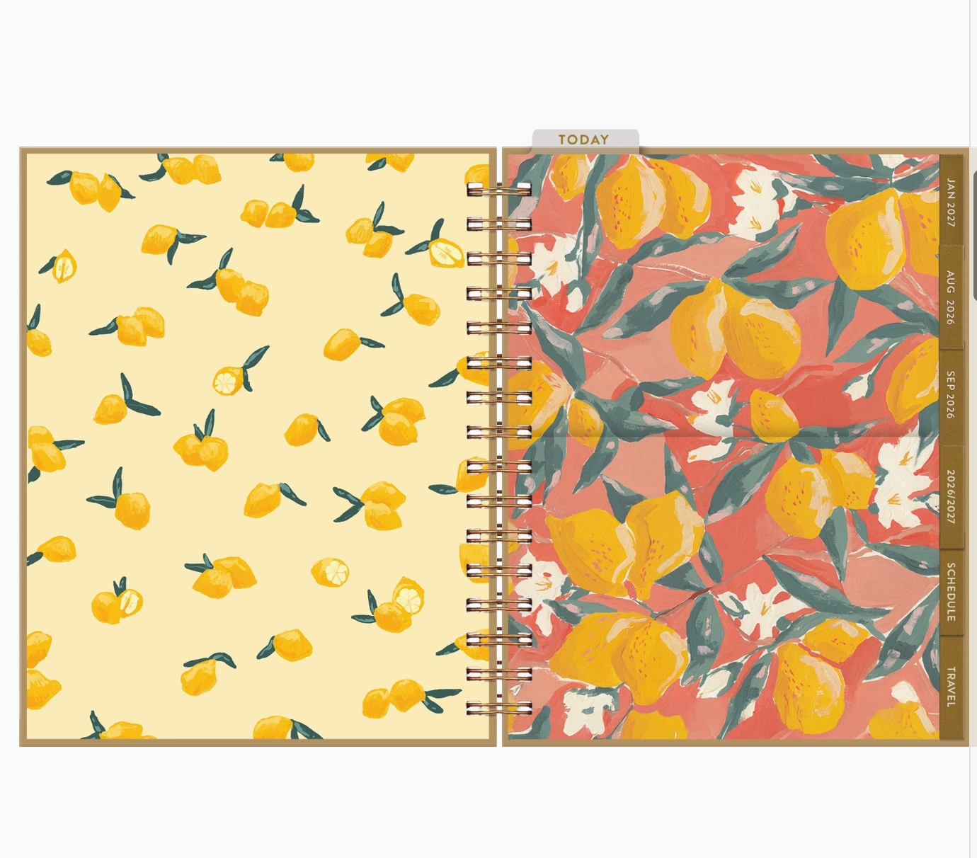 The 2026-2027 planner includes monthly and weekly views, a movable plastic bookmark with ruler and an organizational inside pocket. The hard cover is foil stamped and has a layflat binding with an elastic closure. Special sections include, Year at a glance, Holidays, Celebrations, Schedules, Travel and Notes, even a daily dose of optimism. A sticker sheet to personalize your planner is also included. Foil details and Seed Paper Packaging make this Planner extra special.