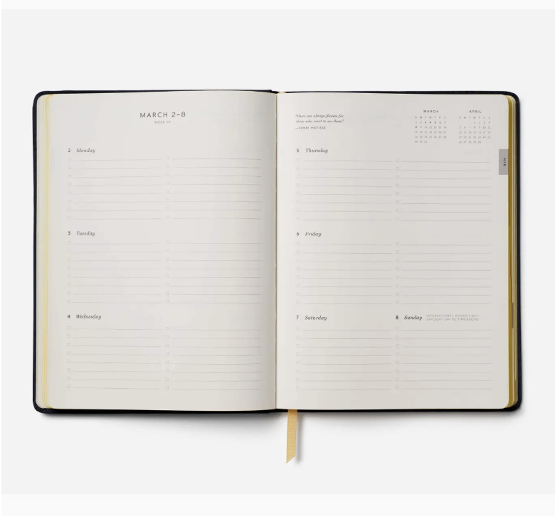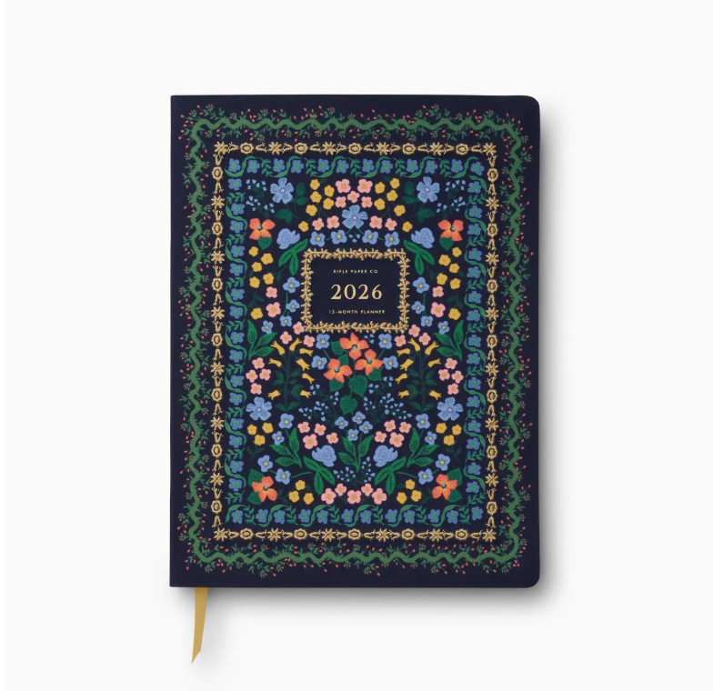 A daily essential with keepsake quality. This fabric-wrapped planner features delicate embroidery, gold foil details, and a gold elastic closure, as well as weekly and monthly views, space for notes and to-dos, and a list of celebrations. Planner spans January - December 2026.