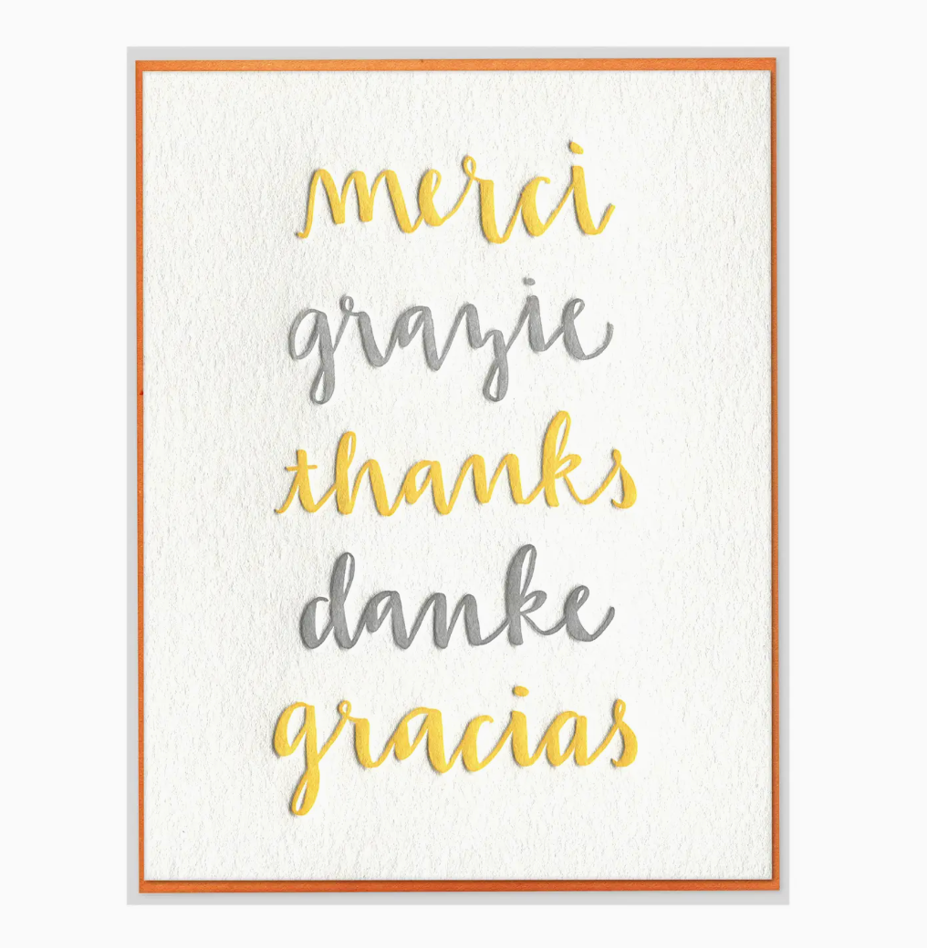 The thank you card for customers who feel gratitude bigger than one language can hold. Five hand-lettered translations of thank you — French, Italian, English, German, and Spanish — turn a simple sentiment into something visually striking and universally resonant, and that multilingual design is what stops browsers mid-scan. Because the person buying this card is not looking for a generic thankful card. They are looking for one that matches the size of what they feel.