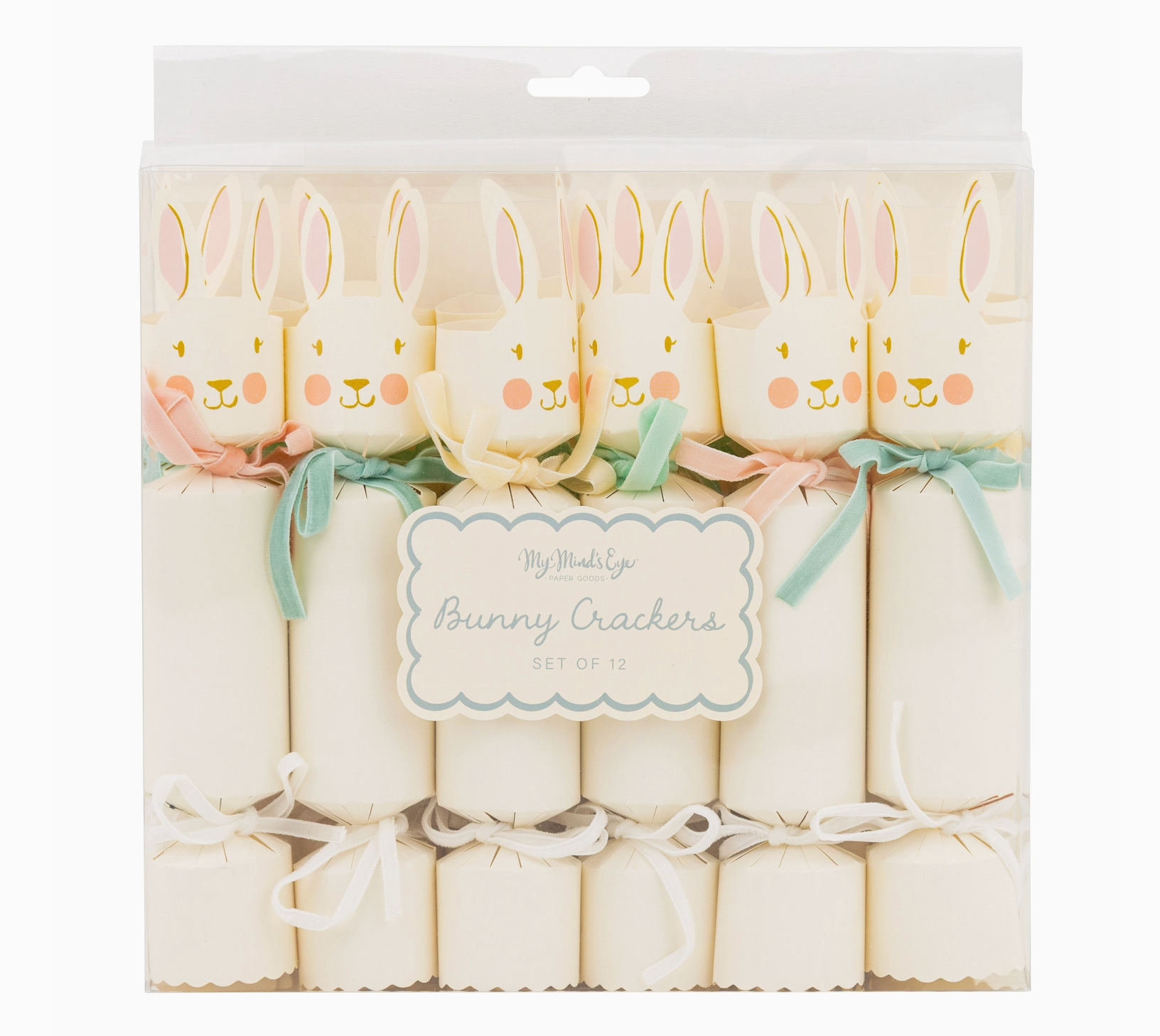 • Bunny crackers with pastel velvet ribbon ties• Set of 12 party crackers: each contains a die, a game, and a tissue crown