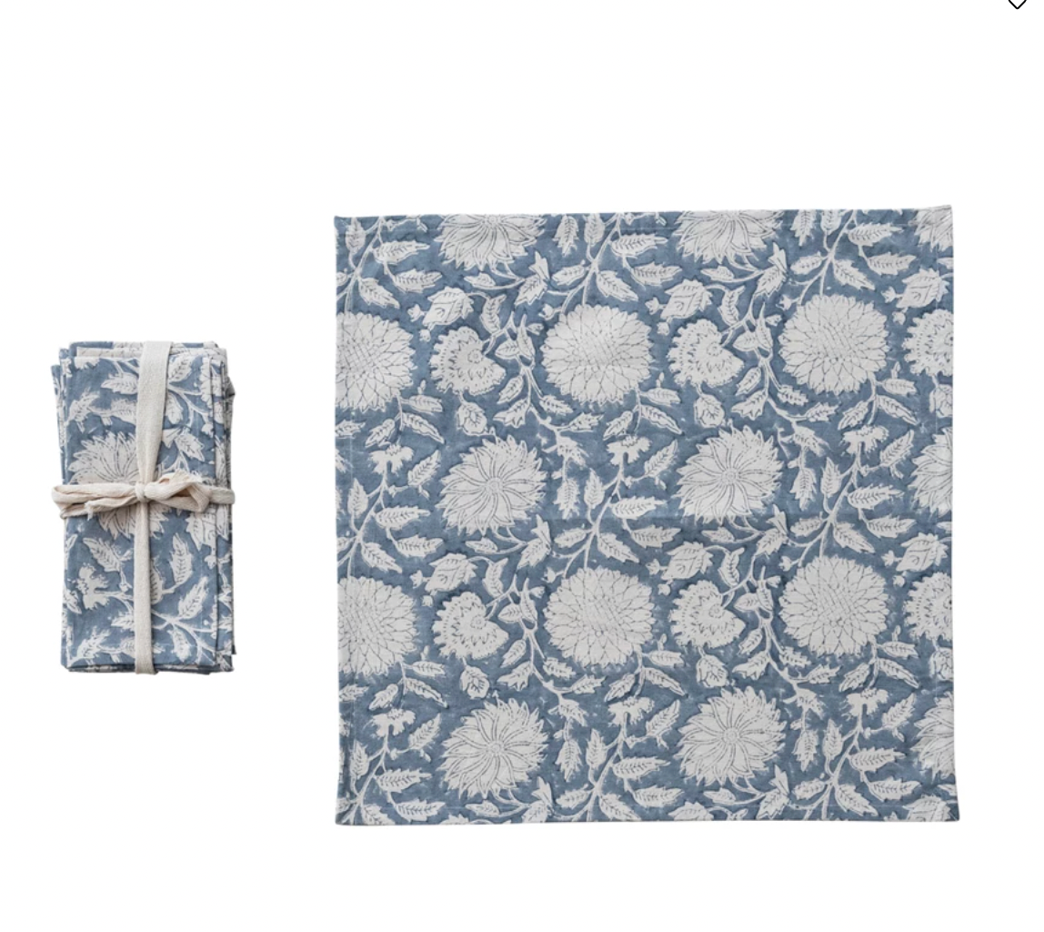 • Catalog Name: 18" Square Cotton & Linen Block Printed Napkins w/ Flowers, Blue & Natural, Set of 4