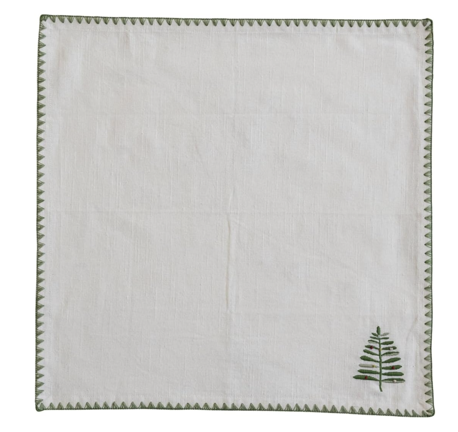 • A lovely and festive set of napkins that features an embroidered tree and edge in green on a natural background