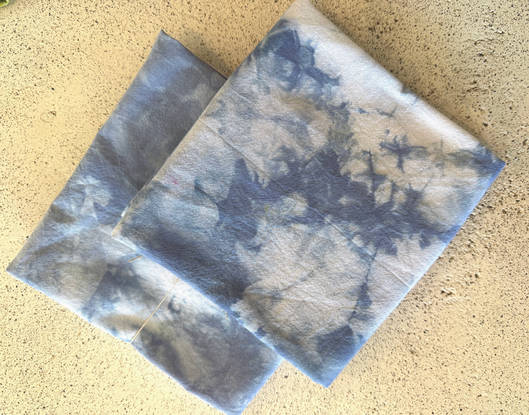 These utilitarian kitchen towels are made of super absorbent cotton and hand dyed on the Central California Coast. The soft periwinkle blues and whites evoke the feeling of happy passing clouds in the sky. They measure 27" x 27" and have a convenient corner hoop for hanging. Machine wash and dry, color safe and already prewashed. Each towel is unique, no two are exactly the same, although they are all similar in color and design. We hope you love these towels as much as we do.