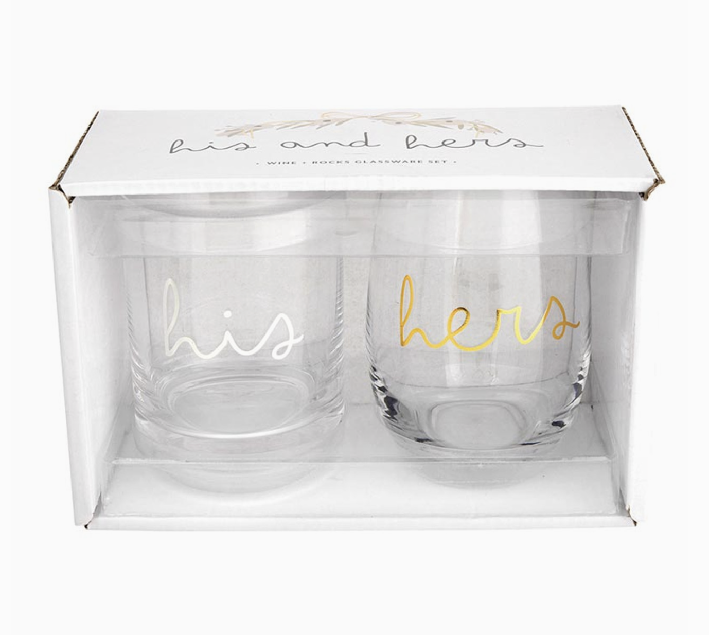 •Stemless Wine Glass reads "Hers" in gold foil•Double Old Fashioned Rocks Glass reads "His" in silver foil•Perfect gift for the happy couple
