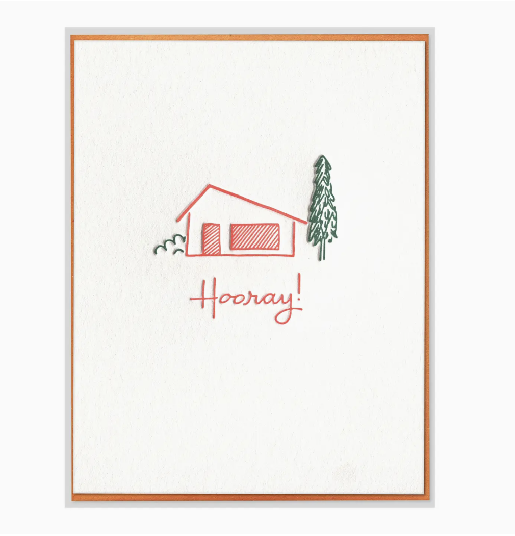 The one your customers grab when someone in their life just closed on a house and they want to celebrate it properly. 'Hooray' paired with a mid-century modern house illustration and vintage-inspired hand-lettered script gives this card a retro charm that stands out against the generic new home cards filling most displays. It feels like a toast in card form, and that celebratory energy is exactly what makes shoppers pick it up without hesitating.