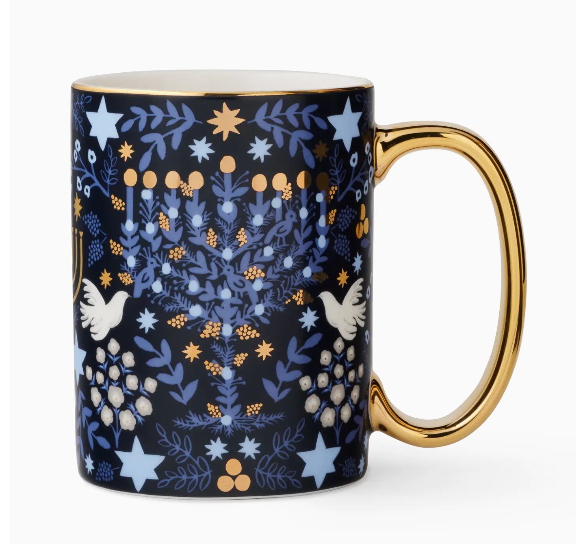 • Illustrated doves, laurels, and glowing candles decorate this porcelain Hanukkah mug, accented by a polished gold handle and rim.