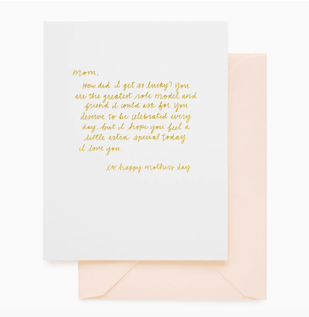 Send a thoughtful message with one of our letterpress printed Mother’s Day greeting cards. A blank interior lets you add your own personal touch. Hand printed in Los Angeles. • 4.25 x 5.5 inches • Folded Card • Foil Printed • Crisp White Paper • Gold Foil • Pale Pink Envelope • MOM61