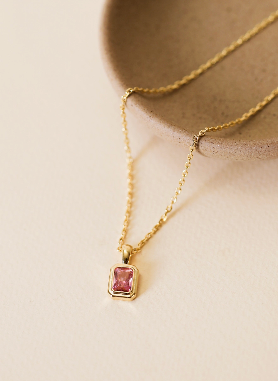 A multi-faceted pink baguette stone set in a gold bezel. Pair with our simple twist chain for a delicate stack.