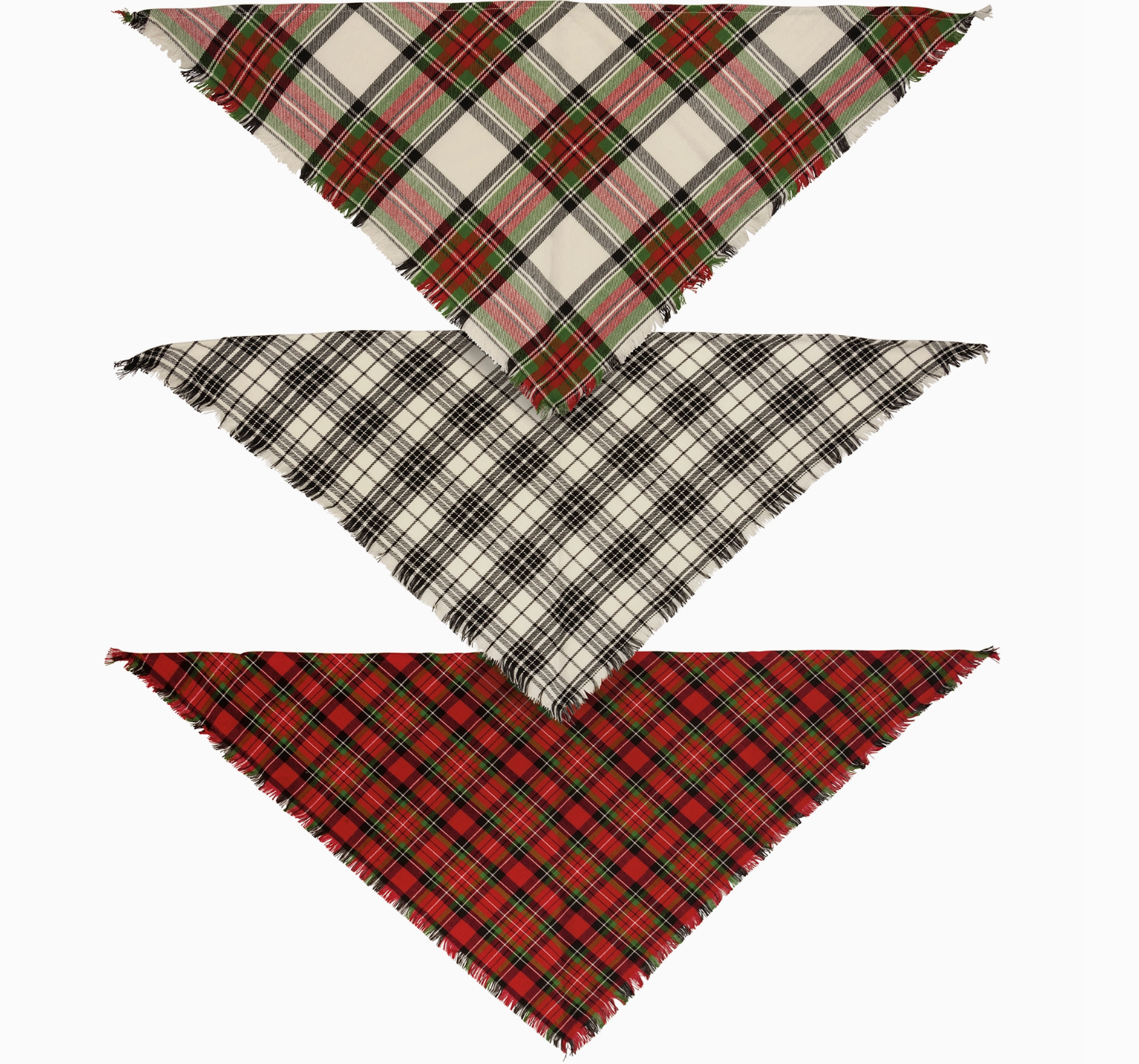 A set of three large pet bandanas from our Pet Collection featuring holiday plaid designs and fashionable fringed trim. Bandanas are folded on a kraft paper card and packaged in a protective polybag.