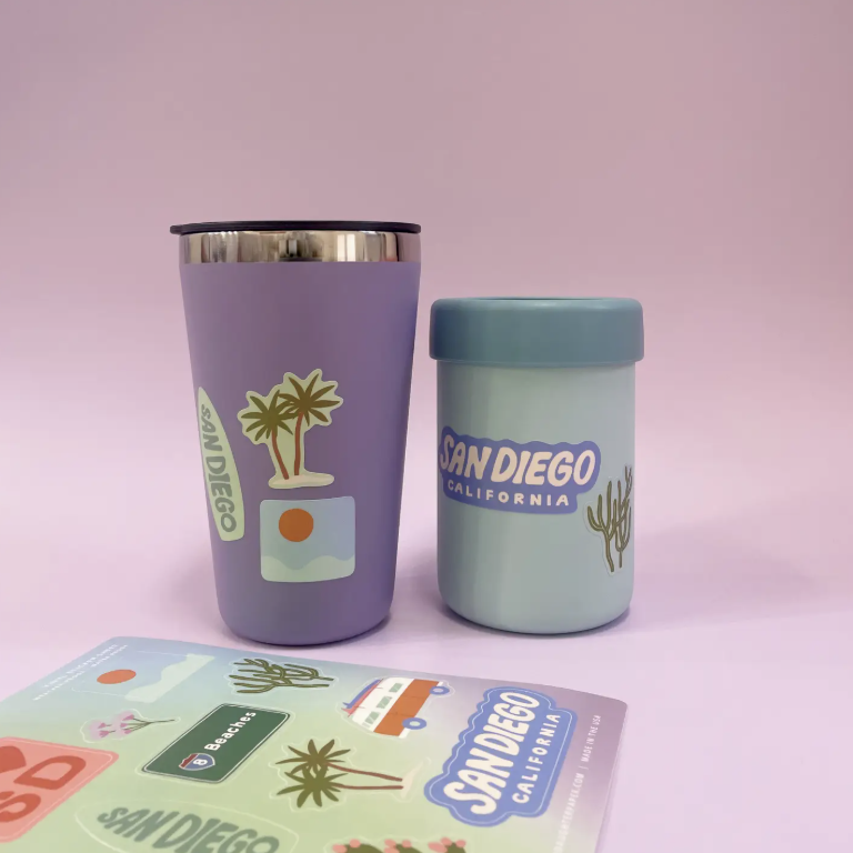 * I heart SD * Sun + Waves * Coastal Flowers * Euphorbia Cactus * Beaches Freeway Sign * San Diego Surf Board * Palm Trees * VW Van with surfboards * Prickly Pear Cactus * San Diego, California