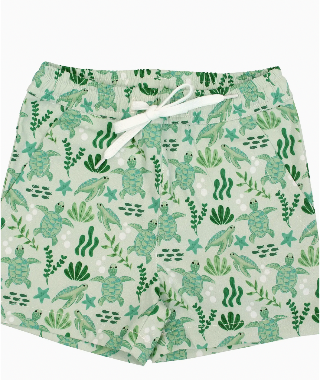 Our swim trunks in our Save the Sea Turtles print are designed for the most comfortable fun at the beach or pool, providing UV protection, while staying soft and comfy for your little one! * FEATURES: The relaxed waistline with adjustable drawstring on our new swim trunks makes it easy to find a comfortable fit for your little one. With deep mesh pockets, your little one can collect tons of fun things on the beach! * UNIQUE PRINTS: Each piece features an in-house designed stylish print. Our artist designed prints in a variety of trending colors and graphics are what make our garments unique. You won't find our exclusive prints anywhere else! With every purchase, a percentage of proceeds goes directly to the Clearwater Marine Aquarium (CMA).