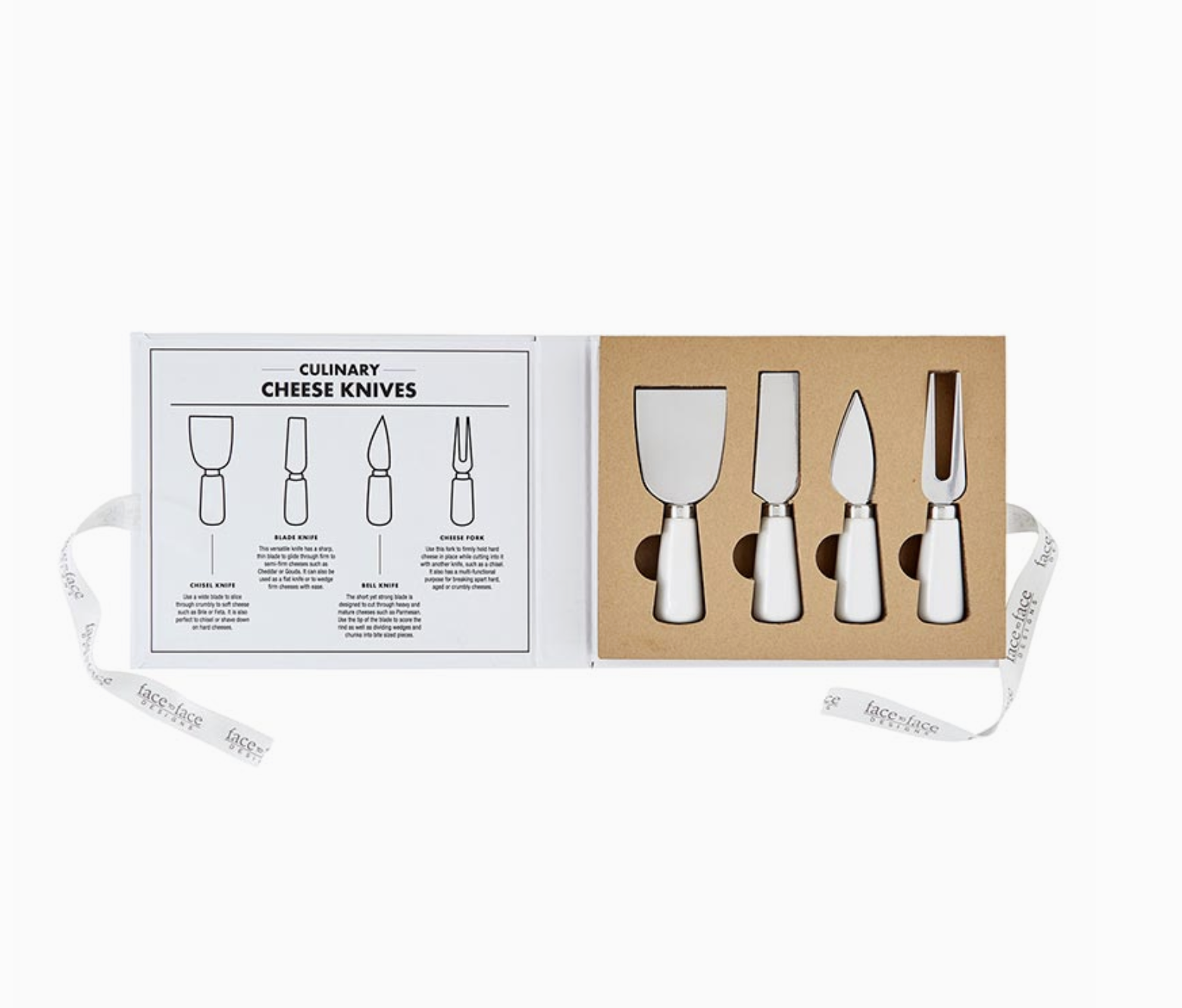Unique cardboard box packaging makes these a great gift for any cheese lover! Set Cheese Fork, Bell Knife, Blade Knife and Chisel Knife. - Cheese fork: Use this fork to firmly hold hard cheese in place while cutting into it with another knife. It can also be used for breaking apart hard, aged or crumbly chesses. - Bell Knife: The short yet strong blade is designed to cut through heavy and mature cheeses such as Parmesan. Use the tip of the blade to score the rind as well as dividing wedges and chunks into bite sized pieces. -Blade Knife: This versatile knife has a sharp, thin blade to glide through firm to semi-firm cheeses such as Cheddar or Gouda. It can also be used as a flat knife or to wedge firm cheeses with ease. -Chisel Knife: Use a wide blade to slice through crumbly to soft cheese such as Brie or Feta. It is also perfect to chisel or shave down on hard cheeses. · Material: Stainless Steel/Ceramic · Box Size: 8.625" W x 7.125" H x 1.25" D · Care Instructions: Hand Wash Only