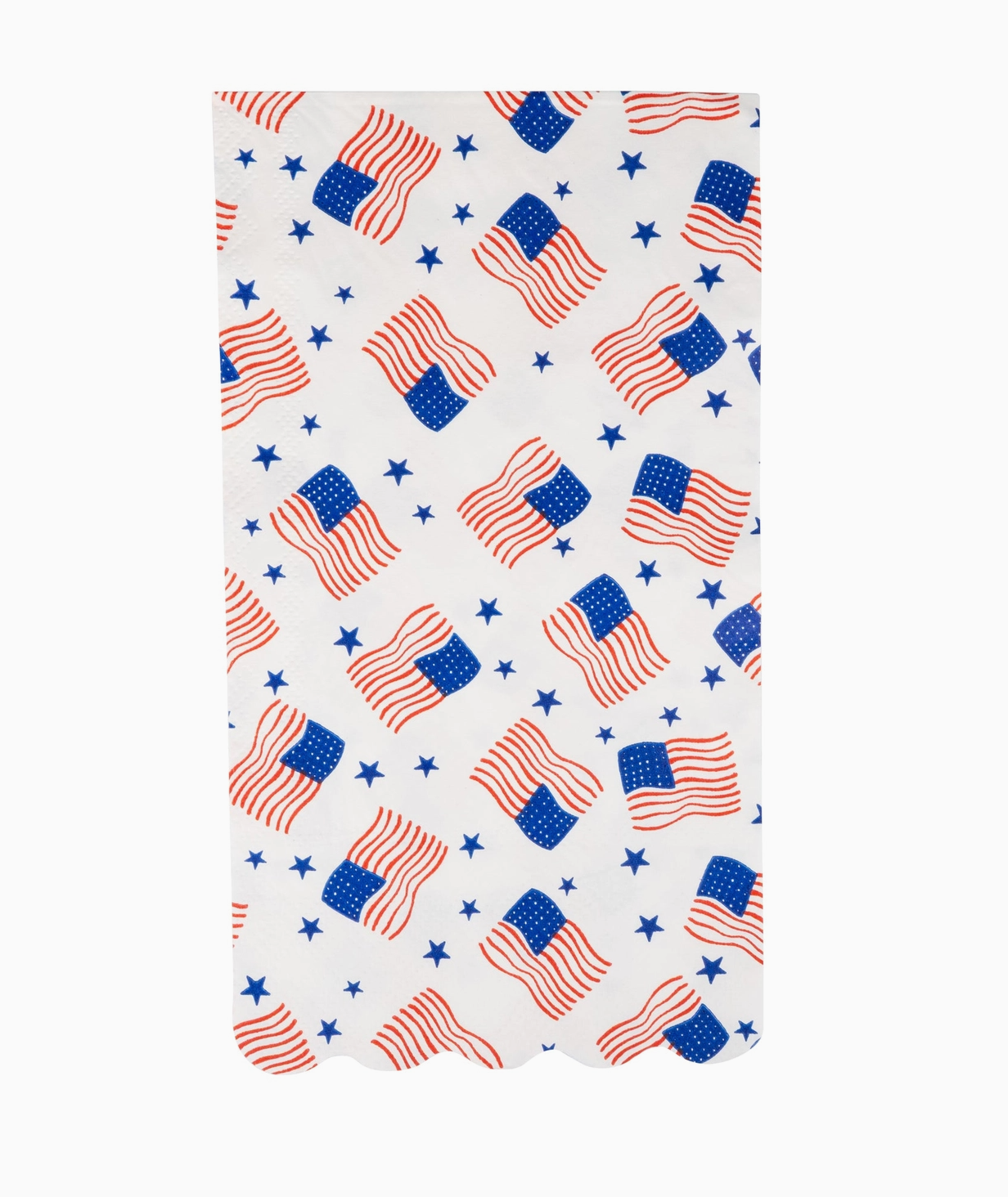 Show off your patriotic spirit with our Scattered Flag Scallop Guest Napkin, perfect for any Fourth of July celebration. With 24 napkins included, you'll have plenty for all your guests to use. The cute flag pattern adds a festive touch to any party decor.