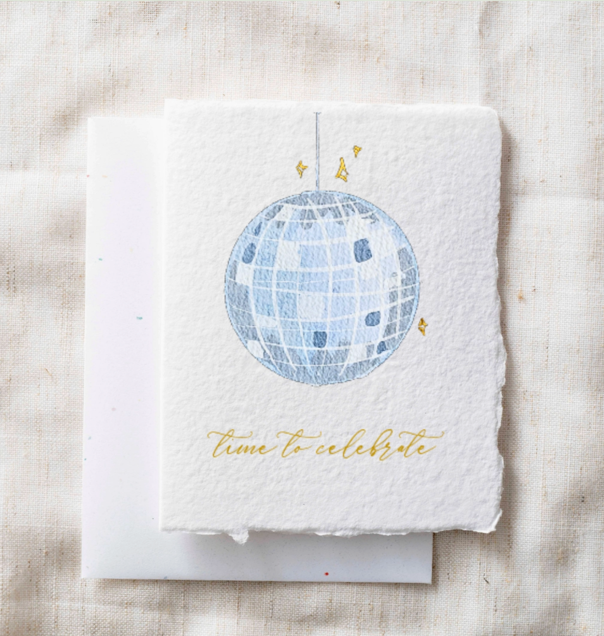 Bring the sparkle with this festive, hand-illustrated Time to Celebrate card—featuring a shimmering disco ball and elegant gold script lettering. Printed on 100% handmade cotton rag paper with soft deckled edges, this card offers a luxe, tactile feel that elevates any celebration. Whether it’s a birthday, engagement, graduation, promotion, or just a reason to dance, this design helps customers mark the moment with style and charm.