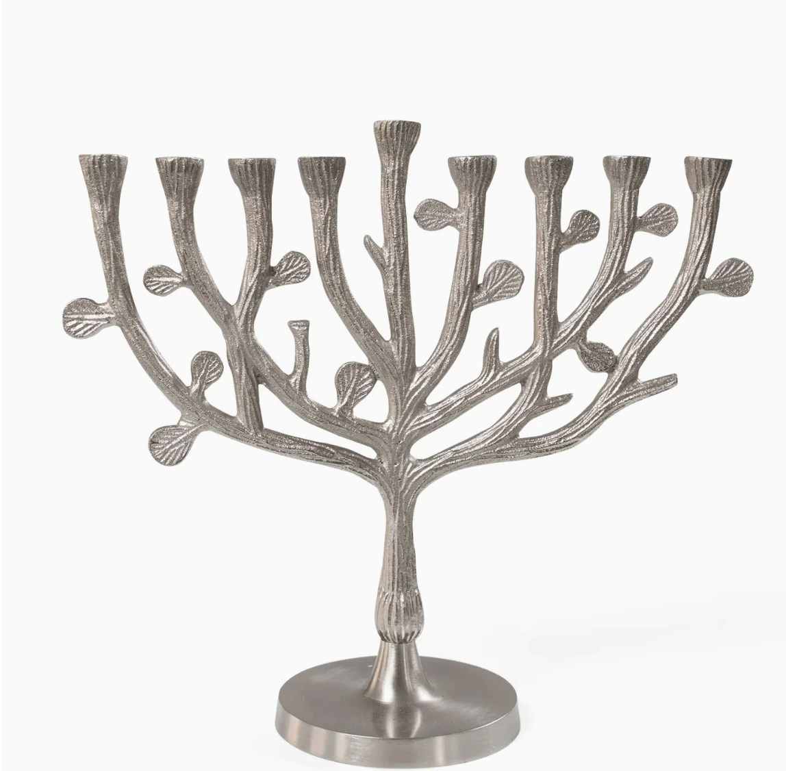 Celebrate growth this Hanukkah with this centerpiece. The Tree of Life Menorah is handmade by artisans working with our fair trade partner Noah’s Ark. Noah's Ark International Exports is a fair trade handicraft marketing organization in Moradabad, India. Noah's Ark provides benefits such as education and medical treatment for artisans and their families. As artisan businesses become more self-sufficient, Noah's Ark takes on new families. Since the company's inception, about 20 artisan workshops have become independent. Noah's Ark started in 1986, in one room of a family house in Moradabad. Businessman Samuel Masih observed that exporters and middlemen were taking advantage of handicraft artisans. He started Noah's Ark to promote these artisans and their crafts. Aluminum - 11Wx10H inches - Candles not included - Handmade in India